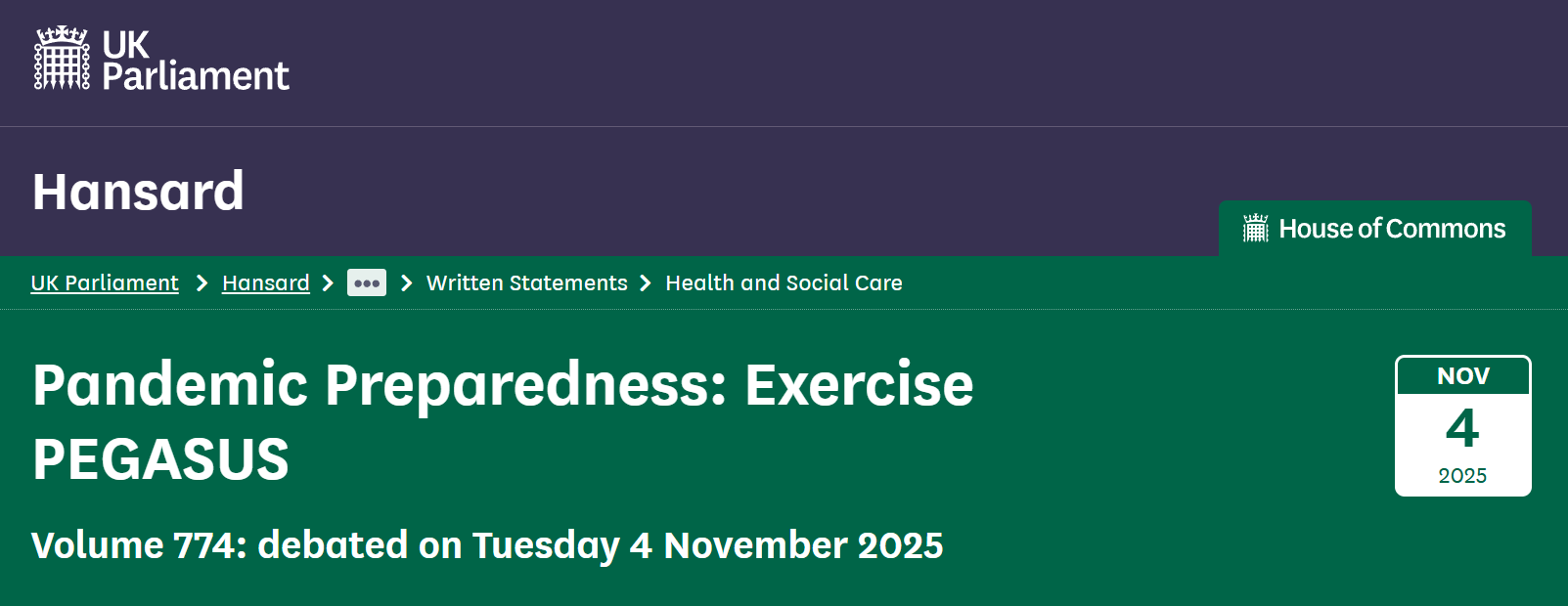 https://hansard.parliament.uk/commons/2025-11-04/debates/251104100000010/PandemicPreparednessExercisePEGASUS